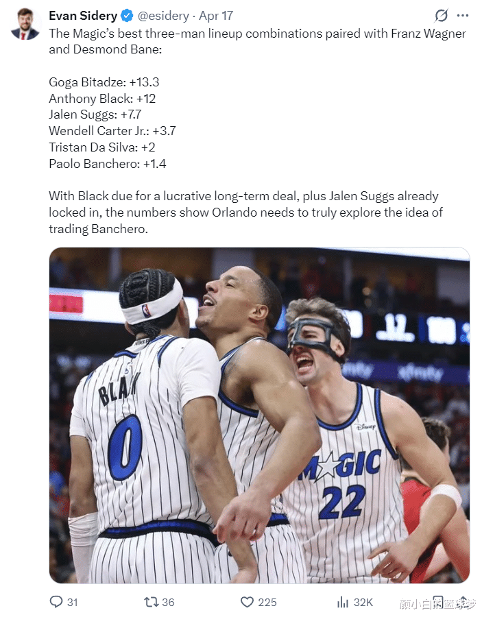 在班凯罗率领魔术在附加赛G1不敌费城后,《福布斯体育》记者埃文-斯迪瑞就写道:小瓦、贝恩搭档最佳三人的效率值:比塔泽+13.3、布莱克+12、萨格斯+7.7、小卡特+3.7、达席尔瓦+2,班凯罗+1.4。