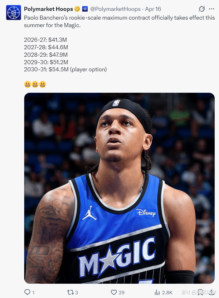 数据媒体也晒出,班凯罗五年2.39亿的顶薪即将生效,26-27赛季薪水高达4130万,如果本赛季的班凯罗还能入选最佳阵容,那么他五年2.39亿会上浮到2.87亿,他下赛季的薪水也会提升到5100万(均薪高达5740万)。这份顶薪在30-31赛季是球员选项。