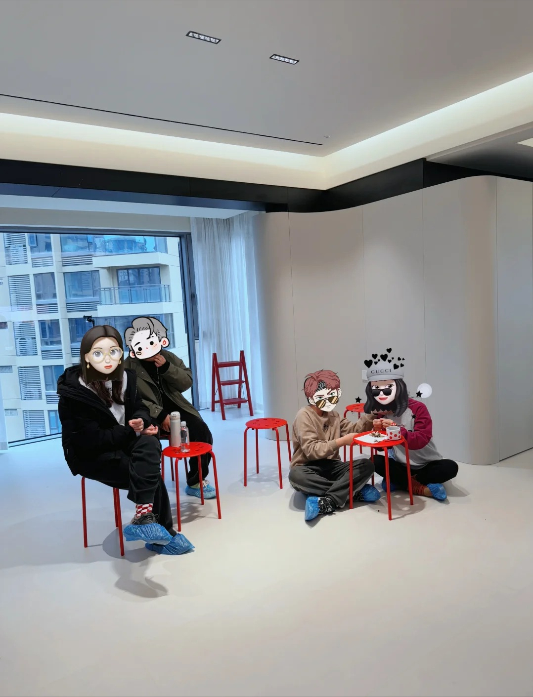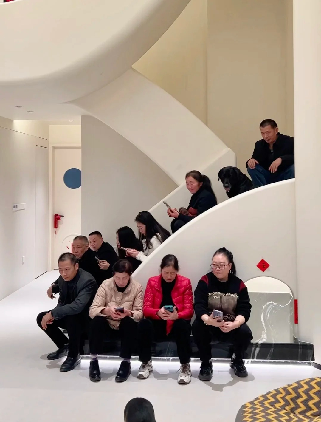 莎莎Aissa花 80 万把 220 平复式装成了送客风,暖家这天,亲戚们都来了,但坐一会儿就想走,因为没有沙发,大家就自动坐楼梯上玩手机了,发到网上有网友说像在某个展厅排队一样,确实还真别说是挺像的。
